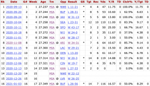 Every game that Fuller surpassed 100 yards receiving he followed it up with less than 60 yards every single time, with 2 instances of less than 38 yards, but in 2020 with DW he had his most consistent year in terms of playing all 11 games before his suspension as well as being a constant TD machine with 8 In 11 games. If Tua can put it all together, he and Fuller could put up huge fantasy points in a 17-game season.