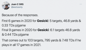 Mike was probably the biggest disappointment in terms of how little they game planned to use him as the weapon that he is. Too many times I would see the game clock and notice it’s the middle of the second quarter and Gesicki was just getting his first target in the game. Mike is one of the few true mismatch TEs in the NFL and when you don’t script 2/3 of the first 15/20 plays to him, what’s the point of even having him on the team?