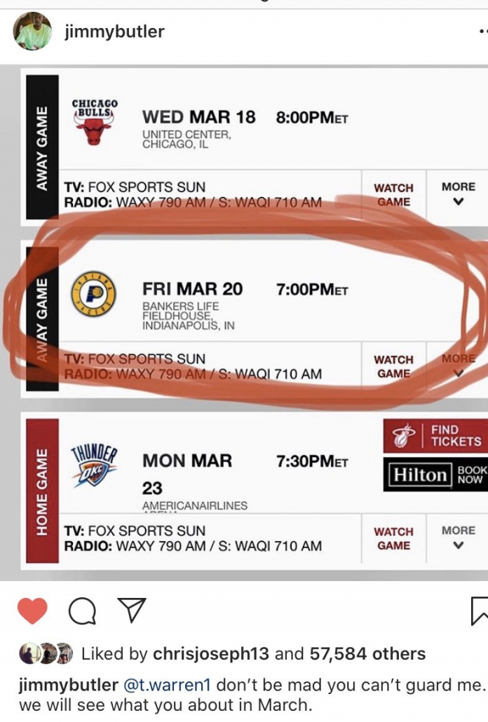 It’s safe to say that Jimmy Butler is looking forward to this matchup. His post on Instagram said it all. Derrick Jones Jr., who played with Warren in Phoenix in 2017-18 also added his two cents on Twitter in regards to Wednesday night. Meyers Leonard did the same. One thing is for certain: There is certainly no love lost between these two teams.
