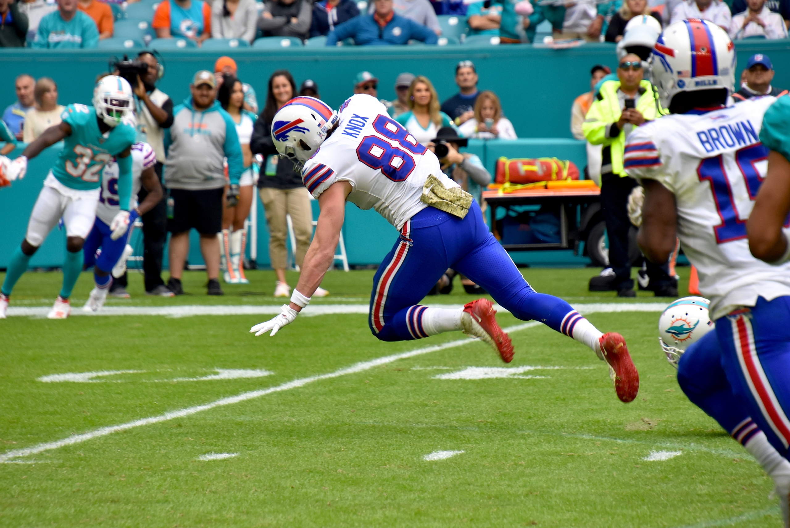 - Bills tight end Dawson Knox caught a pass and stumbles his way to the end zone.