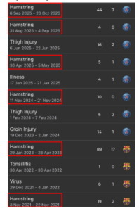 Below are all of the Argentine’s setbacks since 2024. Eight injuries, 127 days on the sidelines (and counting), 14 matches missed. Actually not too many for a player of his age, but one thing that instantly catches the eye is the number of hamstring injuries – they make up half of the total number of setbacks.