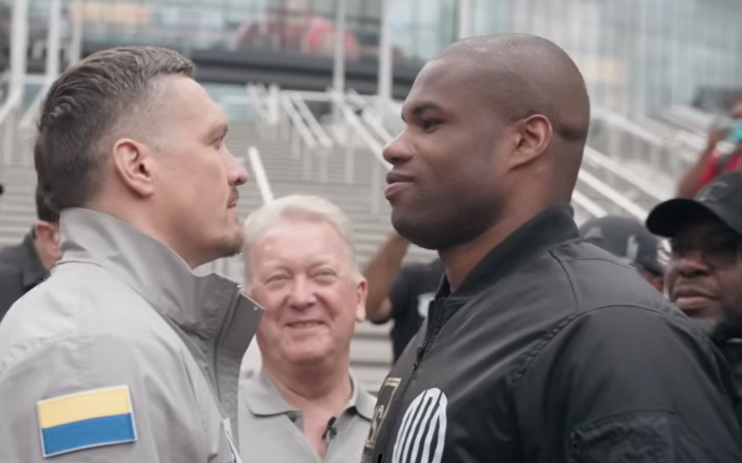 Both fighters stood face-to-face outside Wembley on Tuesday to promote the rematch. Usyk stared chillingly while Dubois yelled “and new” into his face.